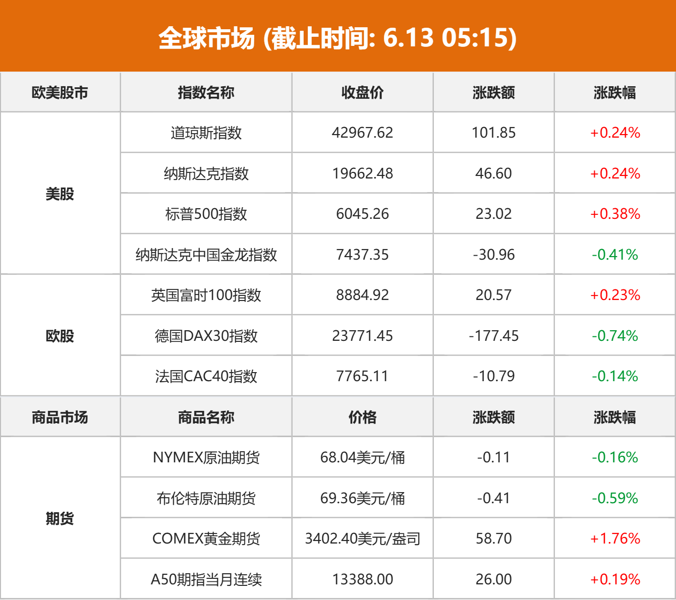 美股市场:美股三大指数06月12日收盘全线上涨。截至收盘,道琼斯工业平均指数比前一交易日上涨101.85点,收于42967.62点,涨幅为0.24%;标准普尔500种股票指数上涨23.02点,收于6045.26点,涨幅为0.38%;纳斯达克综合指数上涨46.6点,收于19662.48点,涨幅为0.24%。标普500指数再创2月底以来收盘新高,道指再创3月初以来收盘新高。