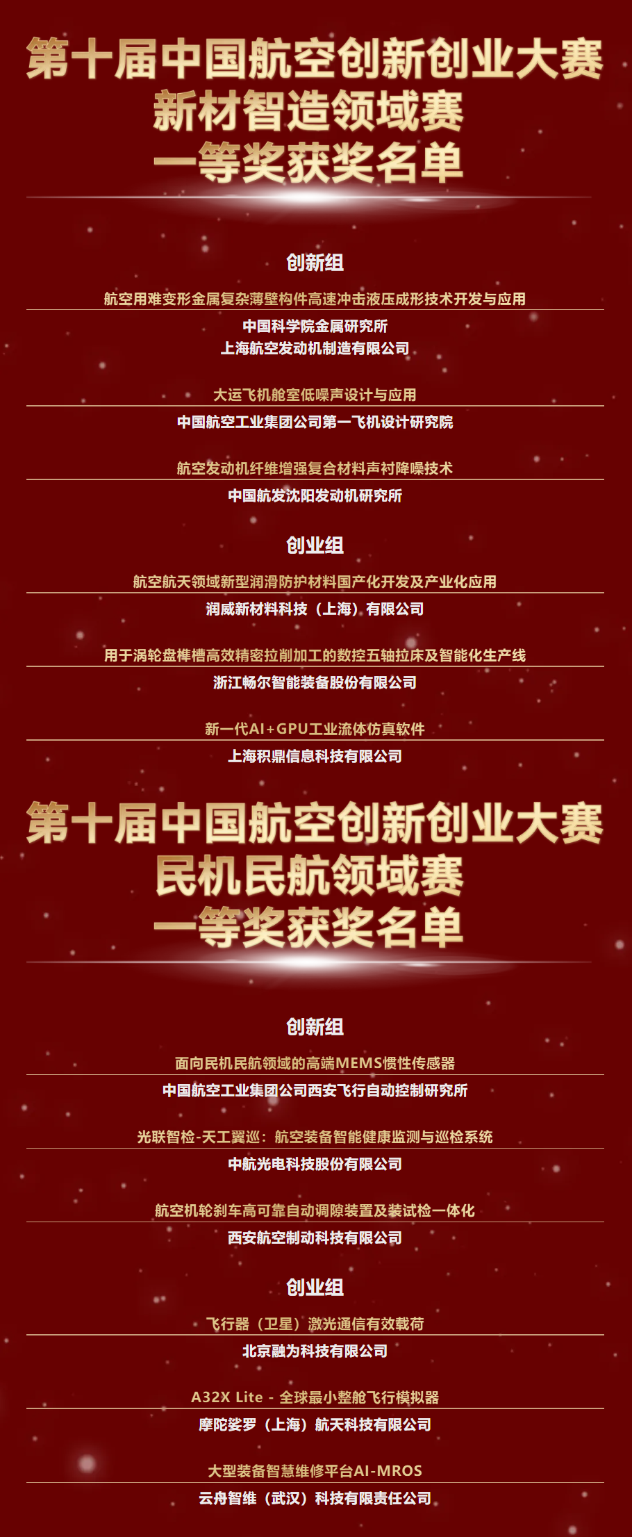 以下分别为第十届中国航空创新创业大赛新材智造领域赛和民机民航领域赛的获奖项目名单。各领域赛一、二等奖进入全国总决赛。