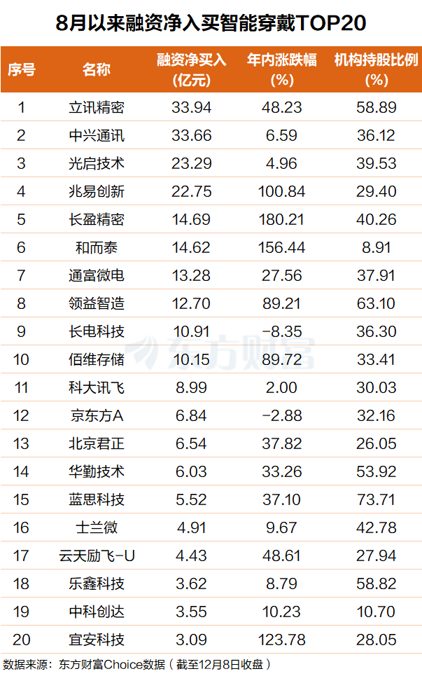 东方财富Choice数据显示,自今年8月以来,杠杆资金吸筹多只智能穿戴概念股,其中立讯精密排名第一,融资净买入34亿元;中兴通讯排名第二,融资净买入超33亿元。