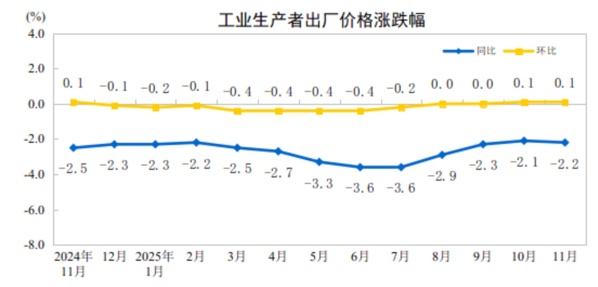 11月,PPI环比上涨0.1%,连续两个月上涨。受上年同期对比基数走高影响,PPI同比下降2.2%,降幅比上月扩大0.1个百分点。