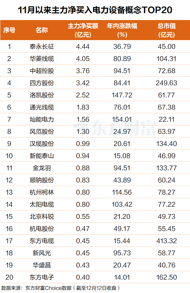 东方财富Choice数据显示,自今年11月以来,主力资金净买入多只电力设备概念股,其中泰永长征排名第一,主力净买入4.4亿元;华菱线缆排名第二,主力净买入超4亿元。