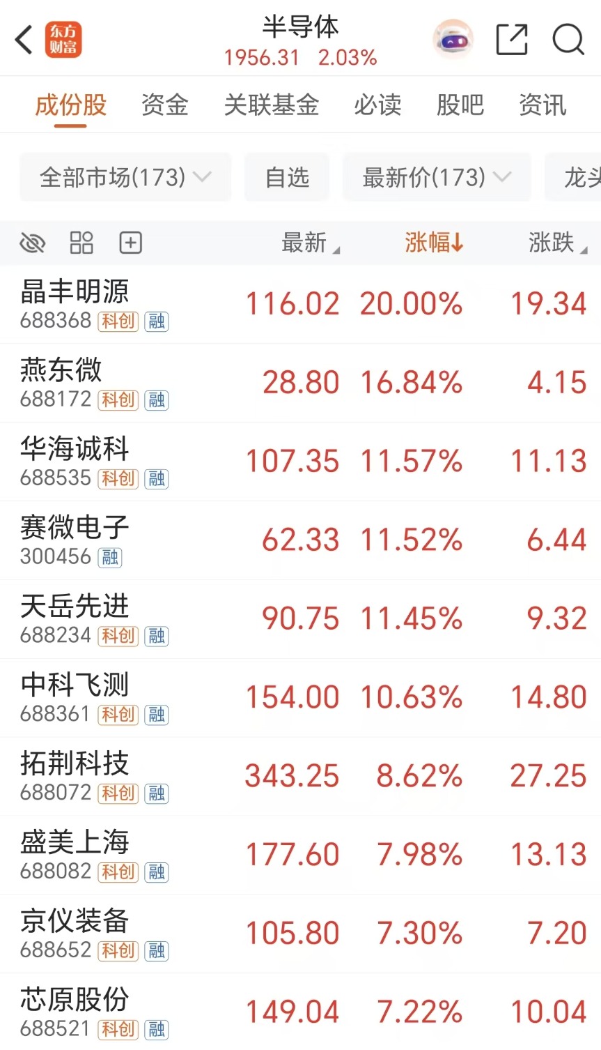 周五(12月12日)半导体板块强势收涨,个股方面,晶丰明源20CM涨停,燕东微涨近17%,华海诚科、赛微电子、天岳先进等个股大涨超11%。