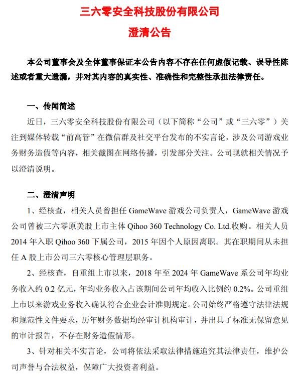 三六零公告,公司注到媒体转载“前高管”在微信群及社交平台发布的不实言论,涉及公司游戏业务财务造假等内容,相关截图在网络传播,引发部分关注。经核查,自重组上市以来,2018年至2024年GameWave系公司年均业务收入约0.2亿元,年均业务收入占该期间公司年均收入比例约0.2%。公司重组上市以来游戏业务收入确认符合企业会计准则规定。公司始终严格遵守法律法规和规范性文件要求,历年财务数据均经审计机构审计,并出具了标准无保留意见的审计报告,不存在财务造假情形。