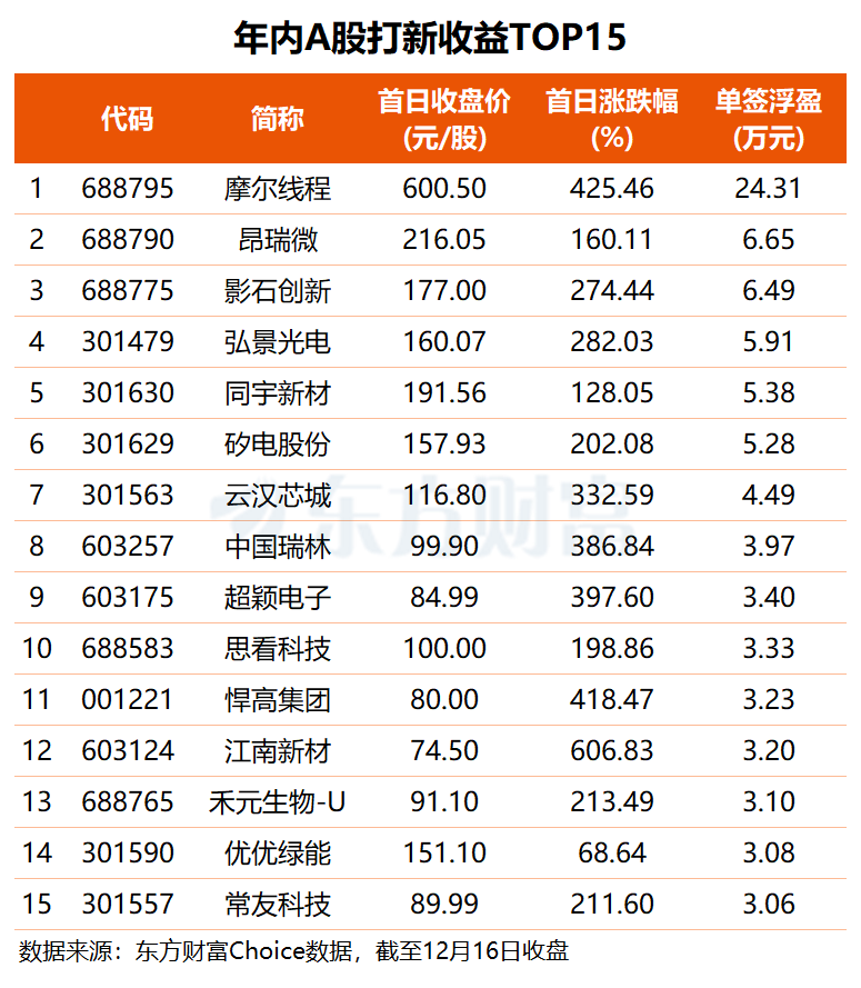 以上市首日收盘价及涨跌幅为基准(下同),摩尔线程的单签浮盈稳居榜首;昨日登陆科创板的国产射频芯片“小巨人”昂瑞微以6.65万元位居次席,公司上市首日收涨160.11%;影石创新排名第三,单签浮盈达6.49万元;弘景光电、同宇新材、矽电股份的单签浮盈均在5万元以上,投资者中一签分别能赚5.91万、5.38万和5.28万元。